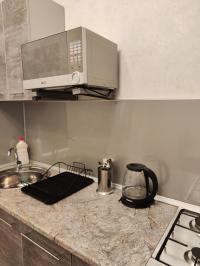 Полностью оборудованная кухня со всем необходимым наполнением (посуда и столовые приборы, чайник, плита, микроволновая печь