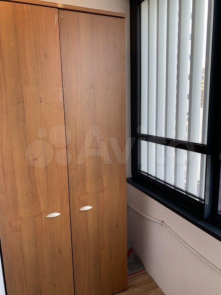 В квартире базовый набор мебели: диван, шкаф, подвесные полки и антресоли.