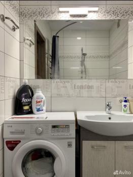 В ванной: стиральная машинка,зеркало с доп освещением,раковина, тумба для хранения, полки для хранения и большая ванна.