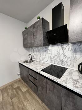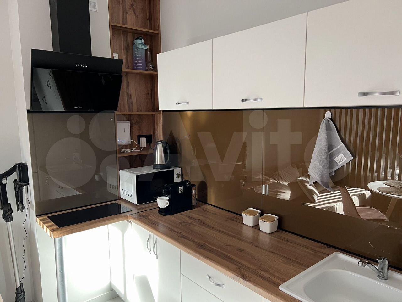 — кухня с варочной панелью, духовым шкафом и микроволновой печью