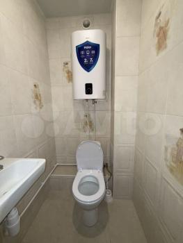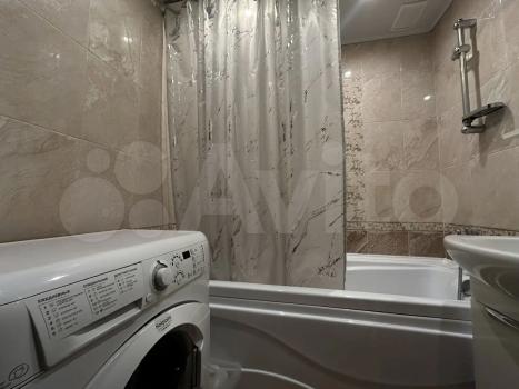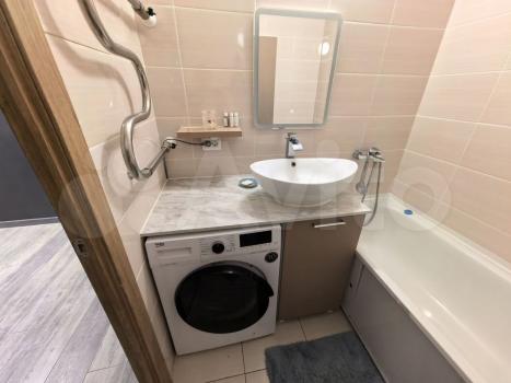 Санузел совмещённый, оборудован ванной и стиральной машиной. В комнате установлены шкафы для хранения вещей и удобный диван.