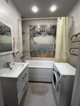 В квартире сделан качественный евроремонт. Уютная кухня, оборудована всем необходимым для комфортного проживания. В комнатах также есть мебель. Ванная комната оснащена ванной, в наличии стиральная машина. Окна выходят во двор, поэтому в квартире тихо и уютно. Предусмотрен застекленный балкон с удобными местами хранения.