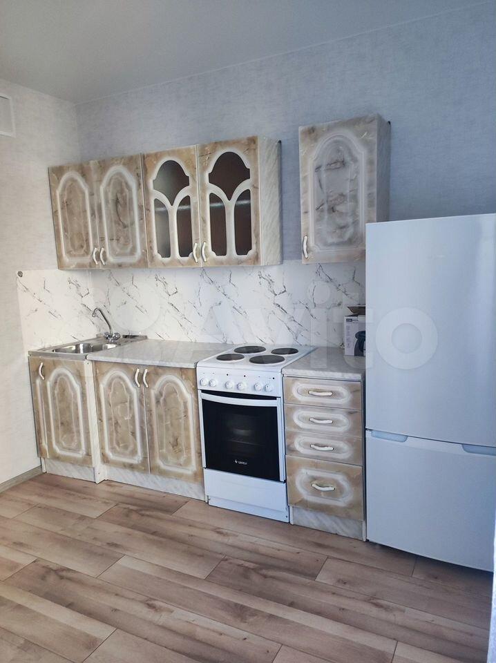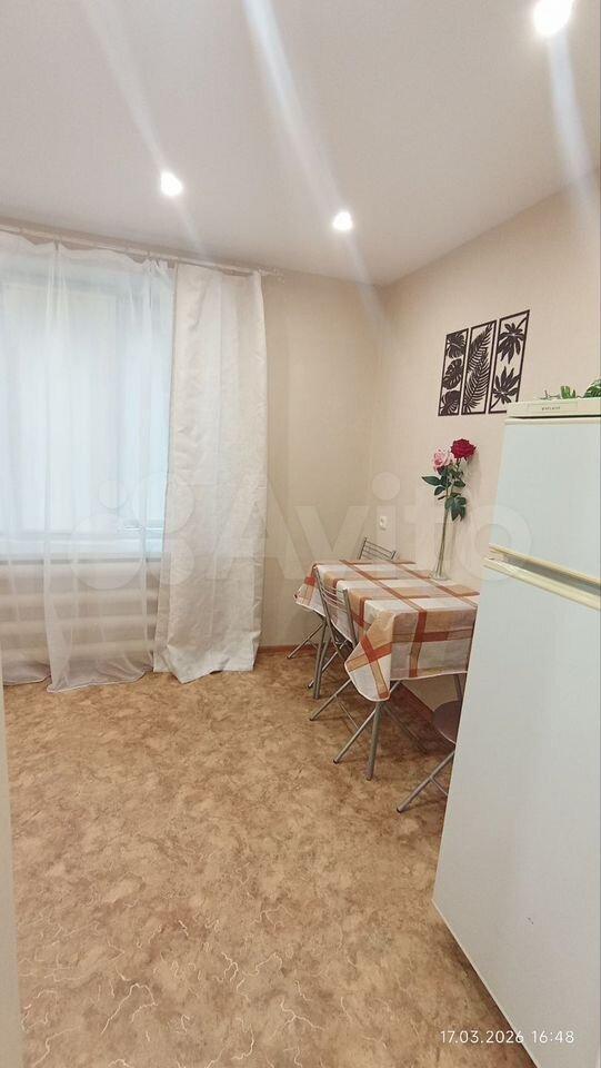 В квартире выполнен косметический ремонт. Просторная кухня оборудована необходимой техникой, включая холодильник и плиту. Санузел раздельный, оформлен в светлых тонах с современной сантехникой.