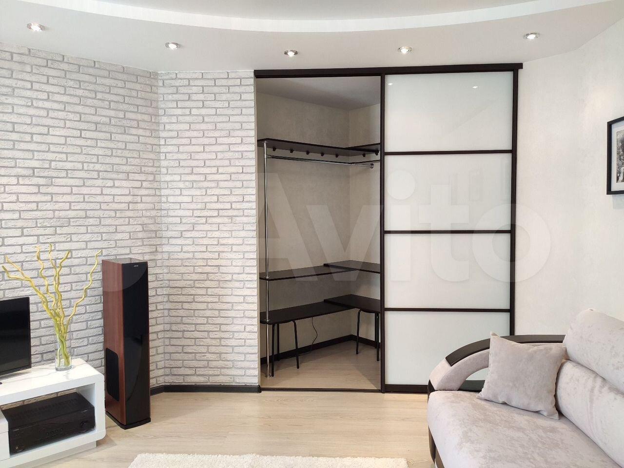 Вместительная гардеробная в комнате, шкаф купе в коридоре, удобный большой раскладной диван, акриловая ванна, дорогая сантехника, на полу ламинат.
