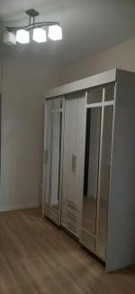 В квартире базовый набор мебели: диван, шкаф, подвесные полки и антресоли.